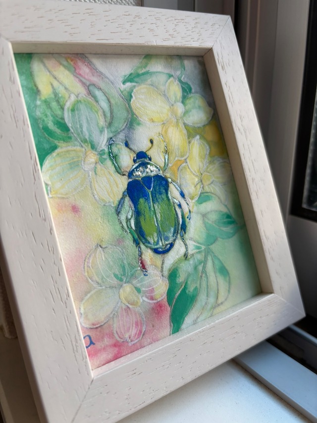 Inspired by a beetle met in the forest, and by the image of an egyptian scarab. 'Scarab Beetle Ⅱ' frame size 4.4x5.8cm 森で出会ったかなぶんと、 スカラベのイメージをインスピレーションに描きました。 額サイズ 4.4x5.8cm 壁掛け金具付き