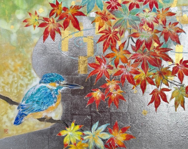 Amid the red of maple leaves, wings shimmer and glint. By the clear waterside, the kingfisher finds its playground. Flying, diving, fluttering, leaping— sending up splashes of water, we dance and whirl. “Playing Among Maple Leaves” F3 size 紅葉の赤の中で 羽がきらきらと 澄んだ水辺が かわせみの遊び場 飛んだり もぐったり はためかせたり はねたり 水しぶきをあげて ぼくたちは舞う 『紅葉に遊ぶ』 F3 Work size : 220x273mm Mineral pigments, washi paper, platinum leaf Set in a wooden frame with an acrylic surface cover. Rady to hung.