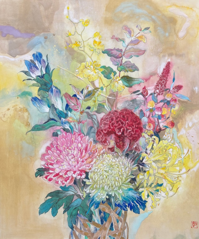 Centered on chrysanthemums, a basket filled with flowers in a rich variety of colors. The harmony woven from the radiant vitality of each bloom— a moment of blossoming. ’Chrysanthemum Flower Basket' F8 size 菊の花を中心に、色とりどりの草花を花かごに描きました。 それぞれの花のもつ、生命の輝きが織りなす調和。 華やぐとき。 F8号 Work size : 455x380mm Mineral pigments, Washi paper , gold leaf Set in a wooden frame with an acrylic surface cover. Rady to hung.