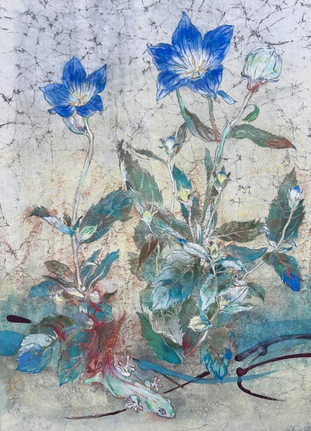 In the cool, crisp air, a hint of autumn drifts in— a field where bellflowers bloom. This garden is dear to me. “The Gecko’s Garden” F4 size ひんやりした空気に 秋の気配を感じる ききょう咲く野 この庭はぼくの自慢なんだ 『やもりの庭』 F4 Work size : 333x242mm Mineral pigments, washi paper, gold leaf Set in a wooden frame with an acrylic surface cover. Rady to hung.
