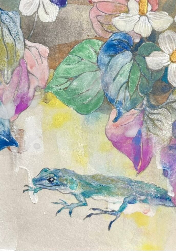 和紙そのままの表情も残しながら、淡い色や濃い色をデリケートに使って描きました。