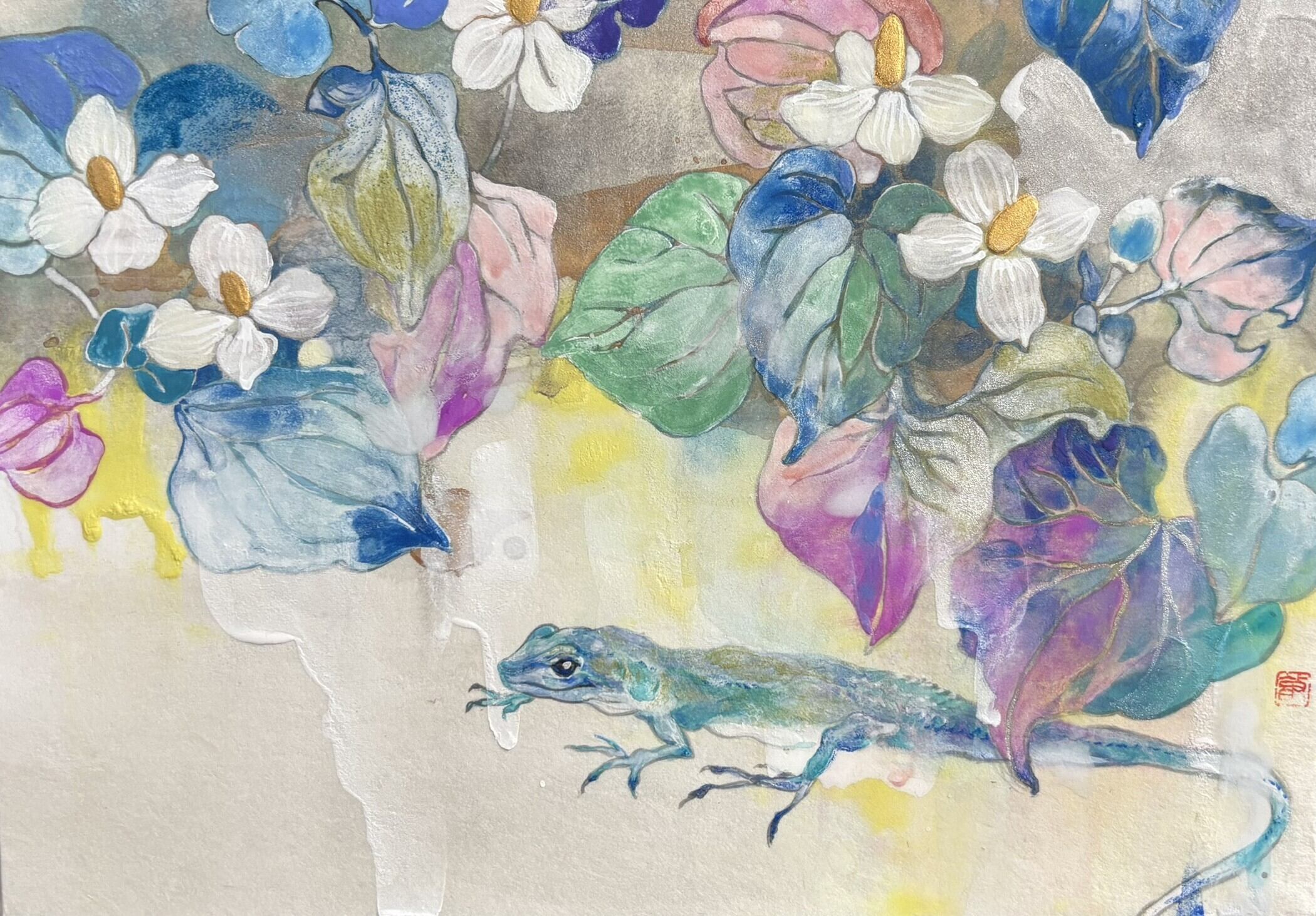In this work, I have preserved the natural texture of the washi paper, using both delicate pale hues and rich, deep tones to capture its quiet, luminous atmosphere.