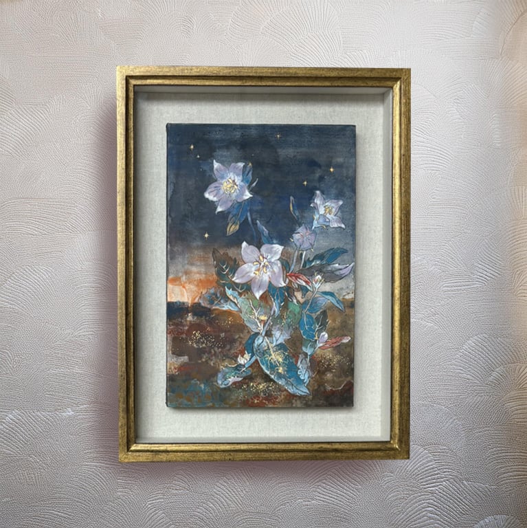 刻一刻と変わる夕暮れの空、浮かんでくる夜の星に共鳴して輝く、ききょうの花を描きました。